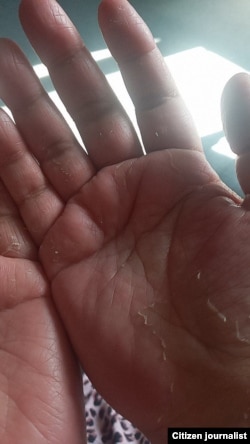Женщина отправила в редакцию «Озодлика» фотографию, на которой видны ее руки с поврежденной кожей в результате воздействия химикатов, с которыми ей приходилось работать на протяжении 1,5 месяцев на консервном заводе.